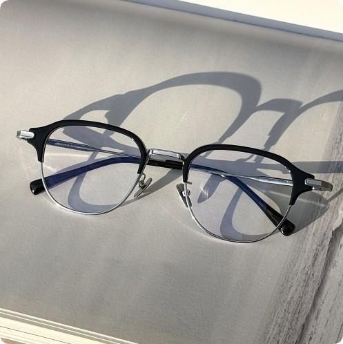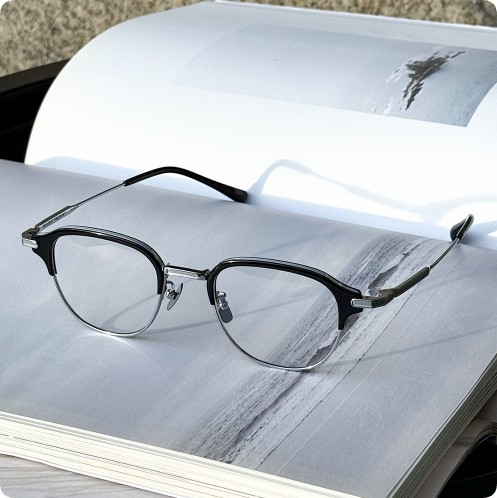 블랙 아세테이트와 실버 티타늄이 만났을 때 뿜어내는 그 서늘하면서도 정돈된 무드는 정말 독보적이에요. 특히 힌지 부분의 정교한 금속 공예 디테일은 안경을 좋아하는 분들이라면 감탄할 수밖에 없는 포인트죠.