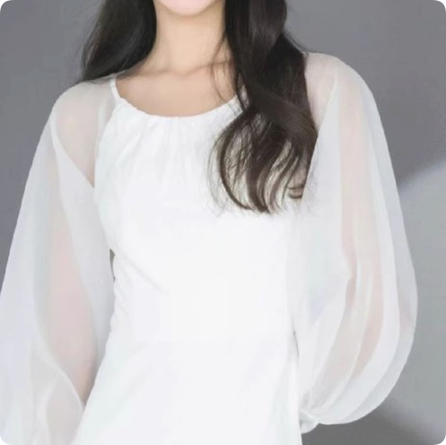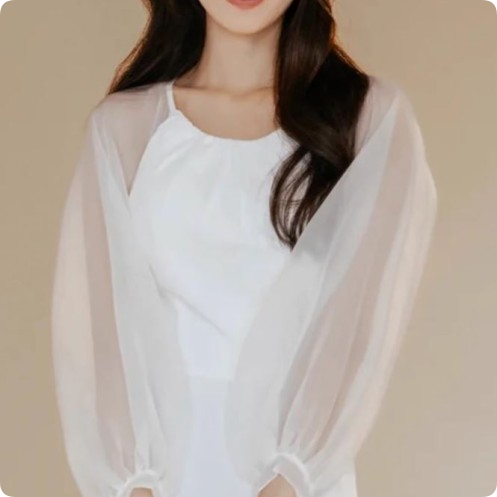 은은하게 비치는 시스루 스타일의 벌룬 소매는 팔 라인을 자연스럽게 커버해주면서도,