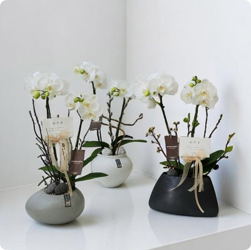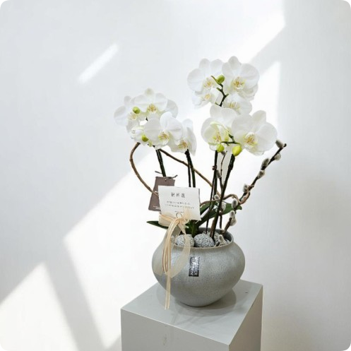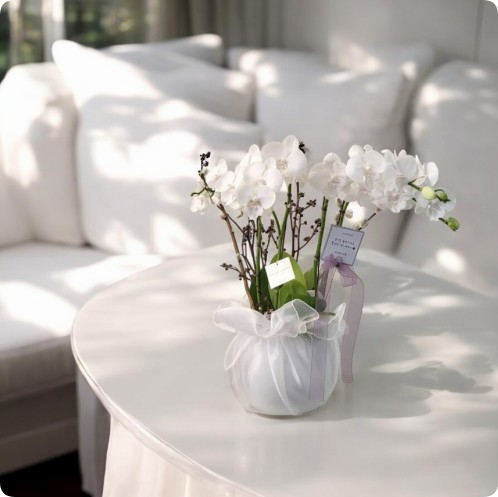 화이트 톤의 깔끔한 호접란에 세련된 화분이 더해지면